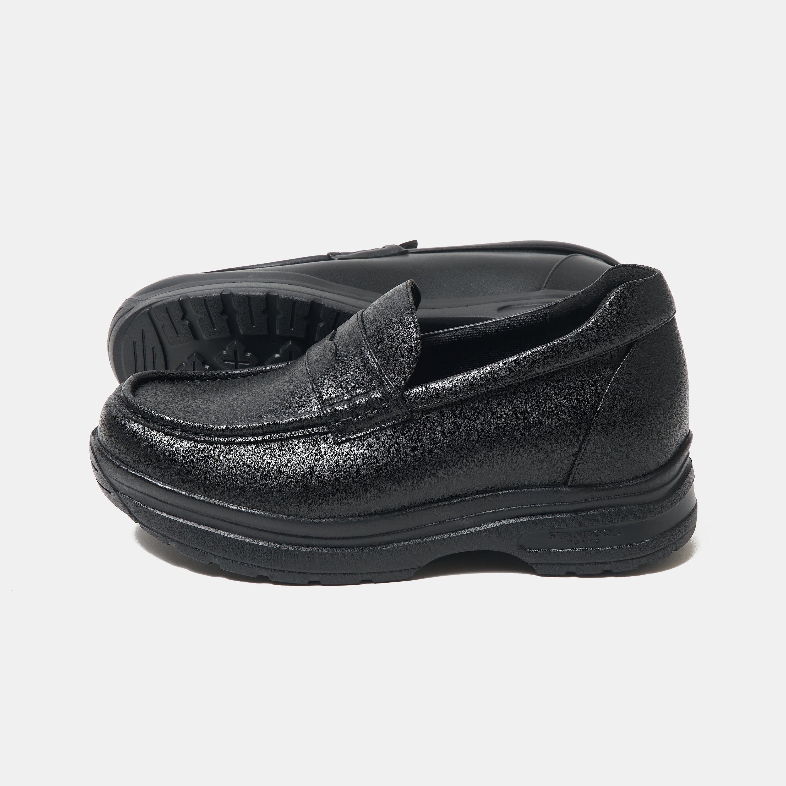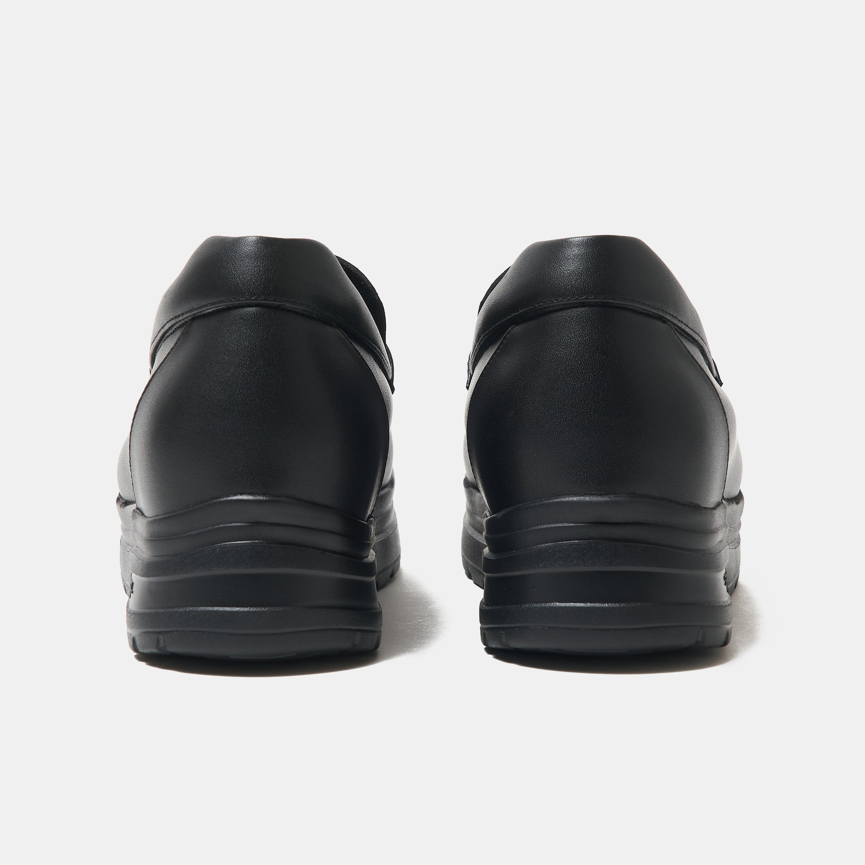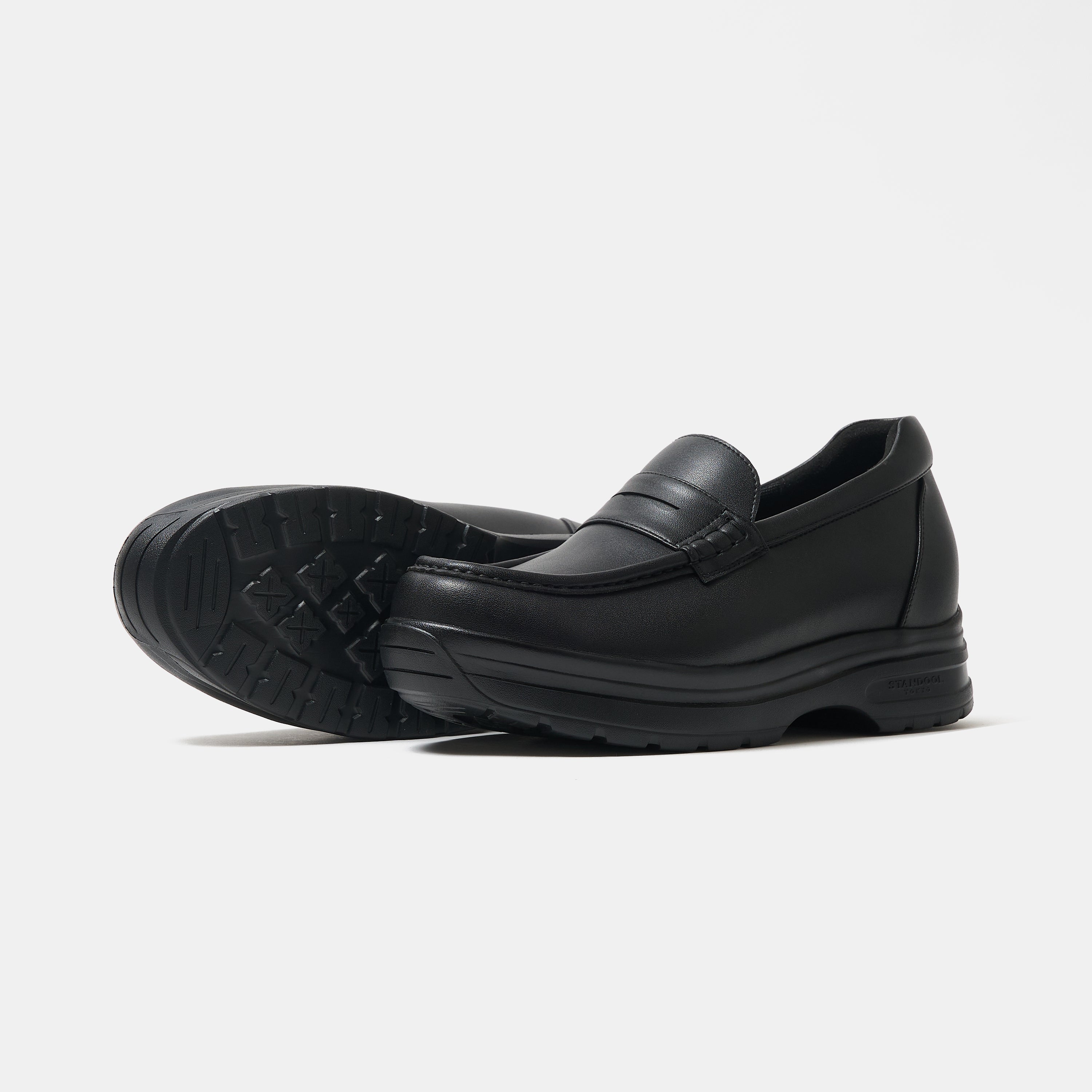 プレーンなローファースニーカーの佇まいの中に、内部にさりげなく高さを仕込んだ構造を備えることで、無理なく自然に6.5cmのスタイルアップを実現。スリムなローファーシルエットが脚のラインをすっきりと整え、足元から全体の印象まで洗練された雰囲気へと引き上げます。